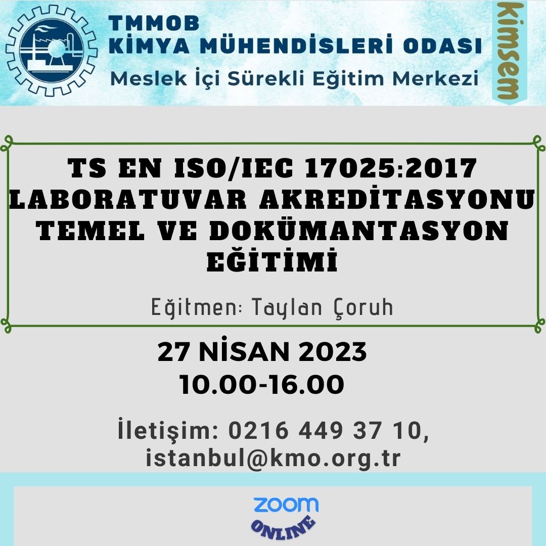 | EĞİTİMİN ADI | TS EN ISO/IEC 17025:2017 Laboratuvar Akreditasyonu Temel Ve Dokümantasyon Eğitimi | | EĞİTMEN | Taylan Çoruh, Kimya Mühendisi | | EĞİTİM YERİ | Eğitimimiz zoom programı üzerinden online gerçekleşecektir. | | EĞİTİMİN TARİHİ VE SAATİ | 27 Nisan 2023, Perşembe/ Saat:10.00-16.00 | | KONTENJAN | Eğitime katılım 25 kişi ile sınırlıdır. (Eğitim sınırlı sayıda katılımcıyla gerçekleşeceğinden öncelikli başvurular değerlendirilecektir.) | | SON BAŞVURU TARİHİ | 25 Nisan 2023 | | KATILIMCILARDA ARANACAK ŞARTLAR (EĞİTİME KİMLER KATILMALI) | Laboratuvar yöneticileri, laboratuvar çalışanları, AR&GE, kalite kontrol, kalite yönetim, ürün güvenliği vb. alanlarda görev yapan Mühendisler ve Kimyagerler ile gelecekte laboratuvarlarda görev yapmayı hedefleyen kişiler. | | EĞİTİMİN İÇERİĞİ | - TS EN ISO /17025 Temel Eğitimi;