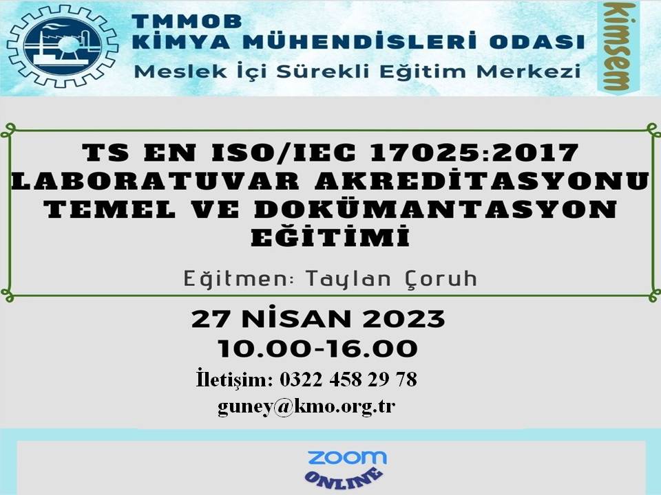 Odamız tarafından 27 Nisan 2023 tarihinde TS EN ISO/IEC 17025:2017 LABORATUVAR AKREDİTASYONU TEMEL VE DOKÜMANTASYON EĞİTİMİ zoom uygulaması üzerinden online olarak düzenlenecektir. Eğitimle ilgili bilgiler aşağıda yer almakta olup eğitime katılmak isteyen kişilerin, başvuru formunu doldurarak guney@kmo.org.tr e-mail adresine göndermelerini rica ederiz.