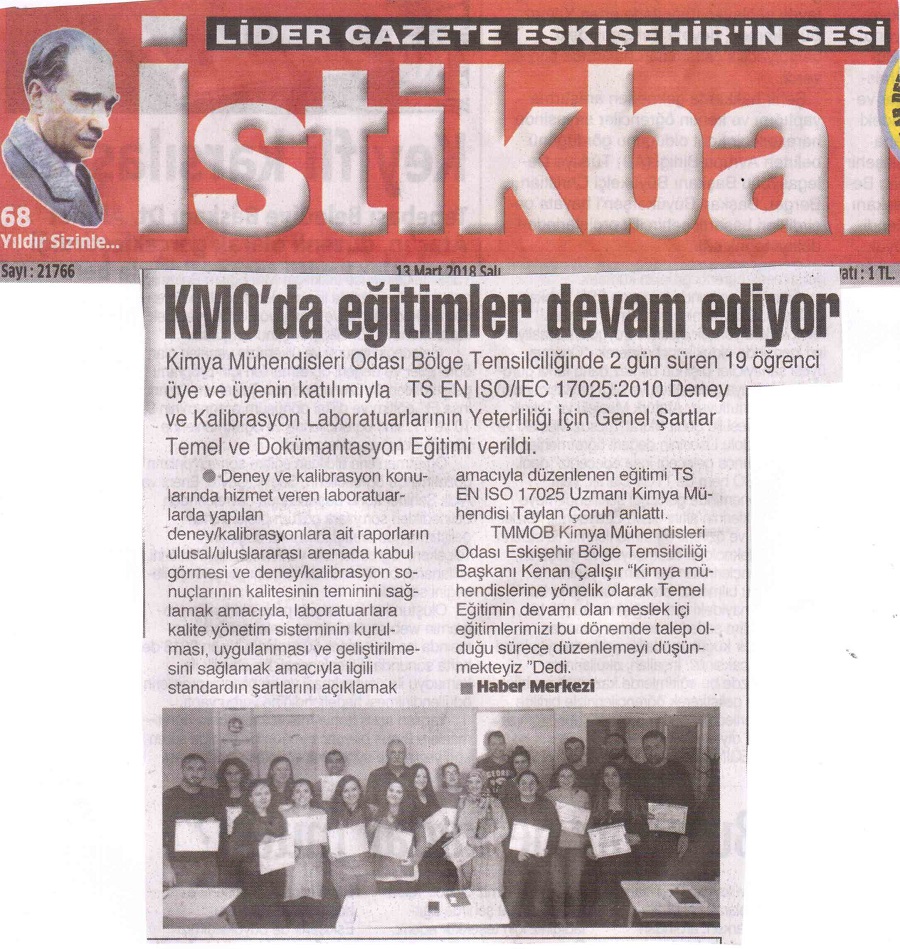 Bölge Temsilciliğimizde ; 10-11 Mart 2018 tarihlerinde Konusunda Uzman KİMSEM Eğitmenİ Kimya Mühendisi BEKİR TAYLAN ÇORUH tarafından TS EN ISO /IEC 17025:2017 Deney ve Kalibrasyon Laboratuarlarının Yeterliliği için Genel şartlar Temel ve Dokümantasyon Eğitimi düzenlendi.