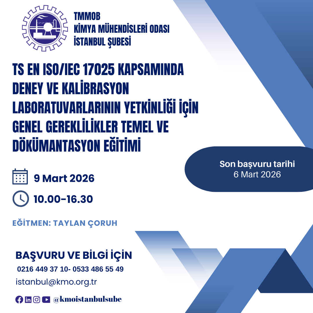 Şubemiz tarafından 9 Mart 2026 tarihinde TS EN ISO/IEC 17025 Kapsamında Deney ve Kalibrasyon Laboratuvarlarının Yetkinliği İçin Genel Gereklilikler Temel ve Dökümantasyon Eğitimi Zoom uygulaması üzerinden online olarak düzenlenecektir. Eğitimin amacı, TS EN ISO/IEC 17025 ‘Deney ve Kalibrasyon Laboratuvarlarının Yeterliliği için Genel Şartlar’ standardının öngörülerinin anlatılması, akreditasyon için yapılması gerekli çalışmaların açıklanmasıdır. Eğitimle ilgili bilgiler aşağıda yer almakta olup eğitime katılmak isteyen kişilerin, başvuru formunu doldurarak istanbul@kmo.org.tr e-mail adresine göndermelerini rica ederiz.