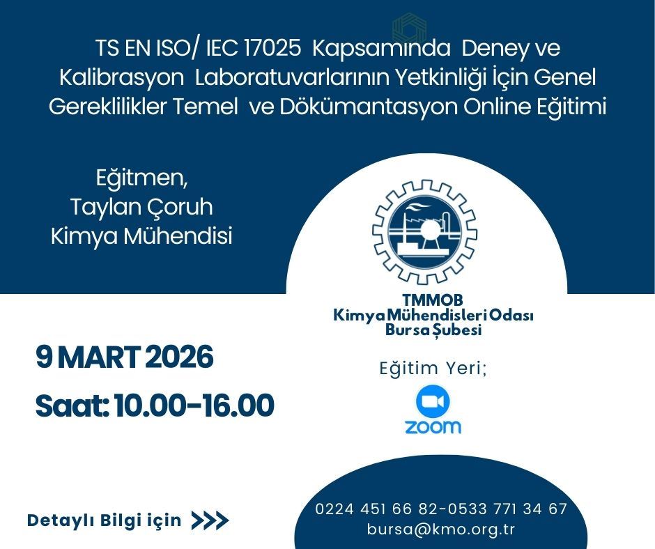 Odamız tarafından 9 Mart 2026 tarihinde “TS EN ISO/IEC 17025 Kapsamında Deney ve Kalibrasyon Laboratuvarlarının Yetkinliği İçin Genel Gereklilikler Temel ve Dökümantasyon Eğitimi” Zoom uygulaması üzerinden online olarak düzenlenecektir.