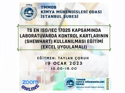 Odamız tarafından 19 Ocak 2023 tarihinde TS EN ISO/IEC 17025 Kapsamında Laboratuvarda Kontrol Kartlarının (Shewhart) Kullanılması Eğitimi (Excel Uygulamalı) zoom uygulaması üzerinden online olarak düzenlenecektir.