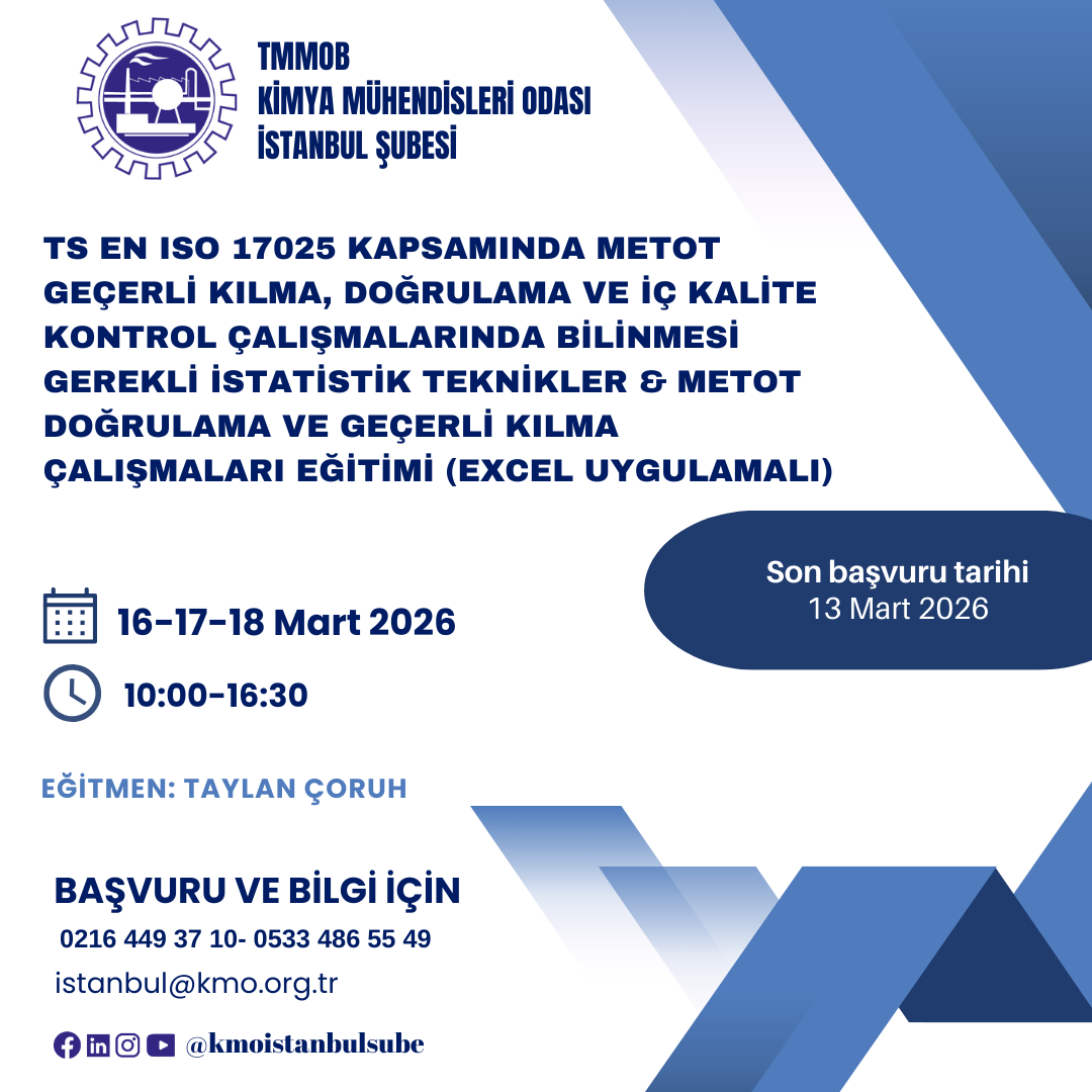 Şubemiz tarafından 16-17-18 Mart 2026 tarihlerinde saat 10.00-16.30 saatleri arasında "TS EN ISO/IEC 17025 Kapsamında Metot Geçerli Kılma, Doğrulama ve İç Kalite Kontrol Çalışmalarında Bilinmesi Gerekli İstatistik Teknikler & Metot Doğrulama ve Geçerli Kılma Çalışmaları" Zoom programı üzerinden online olarak düzenlenecektir. Eğitim ile ilgili detaylı bilgi aşağıda olup eğitime katılmak isteyenlerin, ekteki/dosyalar kısmındaki başvuru formunu doldurup istenen belgeler ile birlikte 13 Mart 2026 tarihine kadar, istanbul@kmo.org.tr adresine göndermelerini rica ederiz.