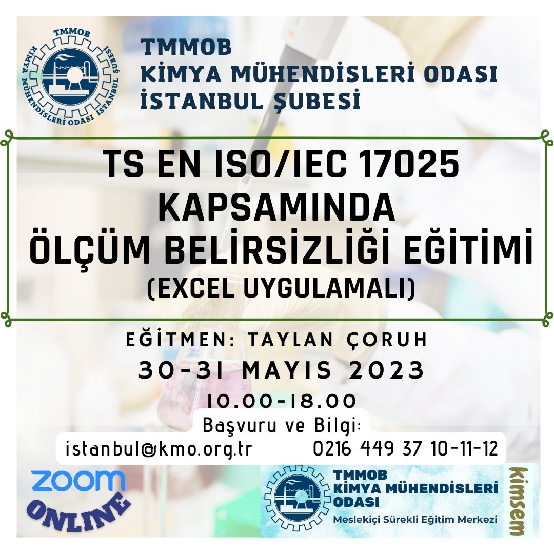 Şubemiz tarafından 30-31 Mayıs 2023 tarihlerinde saat 10.00-18.00 saatleri arasında `TS EN ISO/IEC 17025 Kapsamında Ölçüm Belirsizliği Eğitimi (Excel Uygulamalı)` zoom programı üzerinden online olarak düzenlenecektir.