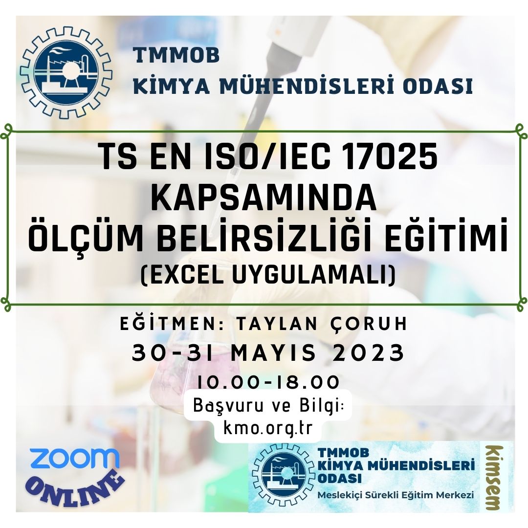 | ÖNEMLİ NOTLAR | (*) Yeterli istatistik bilgisi olmayanların önce istatistik tekniklerinin anlatılacağı "TS EN ISO 17025 Kapsamında Bilinmesi Gerekli İstatistik Teknikler, Metotların Geçerli Kılınması ve Doğrulanması Eğitimine" (24-25-26 Mayıs 2023) katılmaları tavsiye edilir. (**) Eğitimler Excel uygulamalı yapılacağından katılımcıların eğitime Excel yüklü bilgisayarla katılmaları gerekmektedir. |