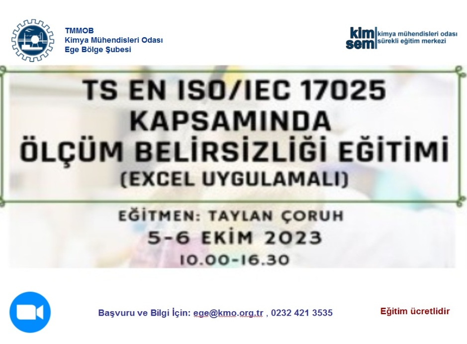 TMMOB Kimya Mühendisleri Odası tarafından 5-6 Ekim 2023 tarihlerinde 10.00-16.30 saatleri arasında "TS EN ISO/IEC 17025 Kapsamında Ölçüm Belirsizliği Eğitimi (Excel Uygulamalı)" zoom programı üzerinden online olarak düzenlenecektir. Eğitim ile ilgili detaylı bilgi aşağıda olup eğitime katılmak isteyenlerin, ekteki/dosyalar kısmındaki başvuru formunu doldurup istenen belgeler ile birlikte 3 Ekim 2023 tarihine kadar ege@kmo.org.tr adresine göndermelerini rica ederiz.