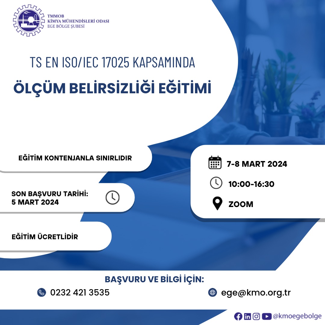 Odamız tarafından 7-8 Mart 2024 tarihlerinde saat 10.00-16.30 saatleri arasında "TS EN ISO/IEC 17025 Kapsamında Ölçüm Belirsizliği Eğitimi (Excel Uygulamalı)" zoom programı üzerinden online olarak düzenlenecektir. Eğitim ile ilgili detaylı bilgi aşağıda olup eğitime katılmak isteyenlerin, ekteki/dosyalar kısmındaki başvuru formunu doldurup istenen belgeler ile birlikte 5 Mart 2024 tarihine kadar, ege@kmo.org.tr adresine göndermelerini rica ederiz.