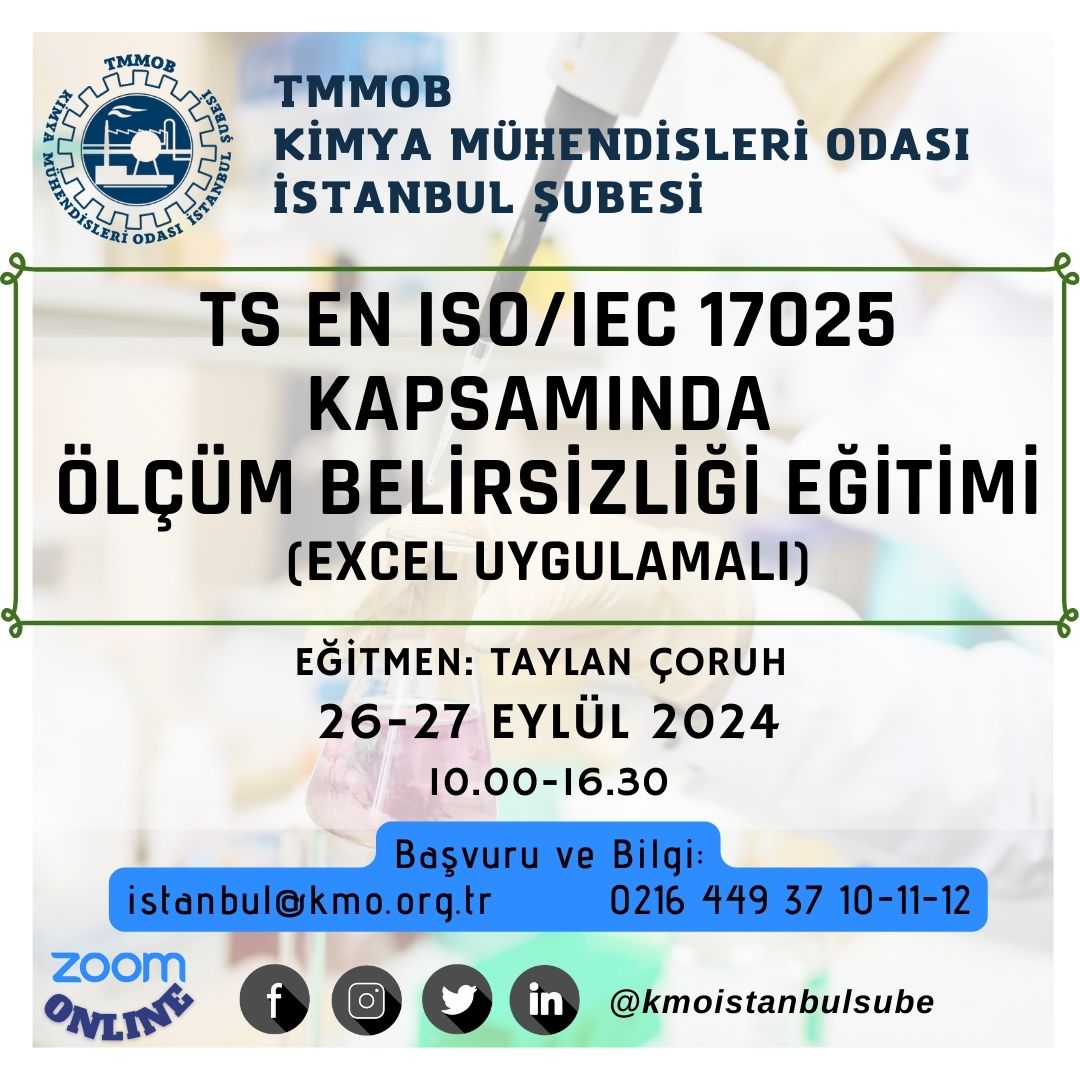 Şubemiz tarafından 26-27 Eylül 2024 tarihlerinde saat 10.00-16.30 saatleri arasında `TS EN ISO/IEC 17025 Kapsamında Ölçüm Belirsizliği Eğitimi (Excel Uygulamalı)` zoom programı üzerinden online olarak düzenlenecektir.
