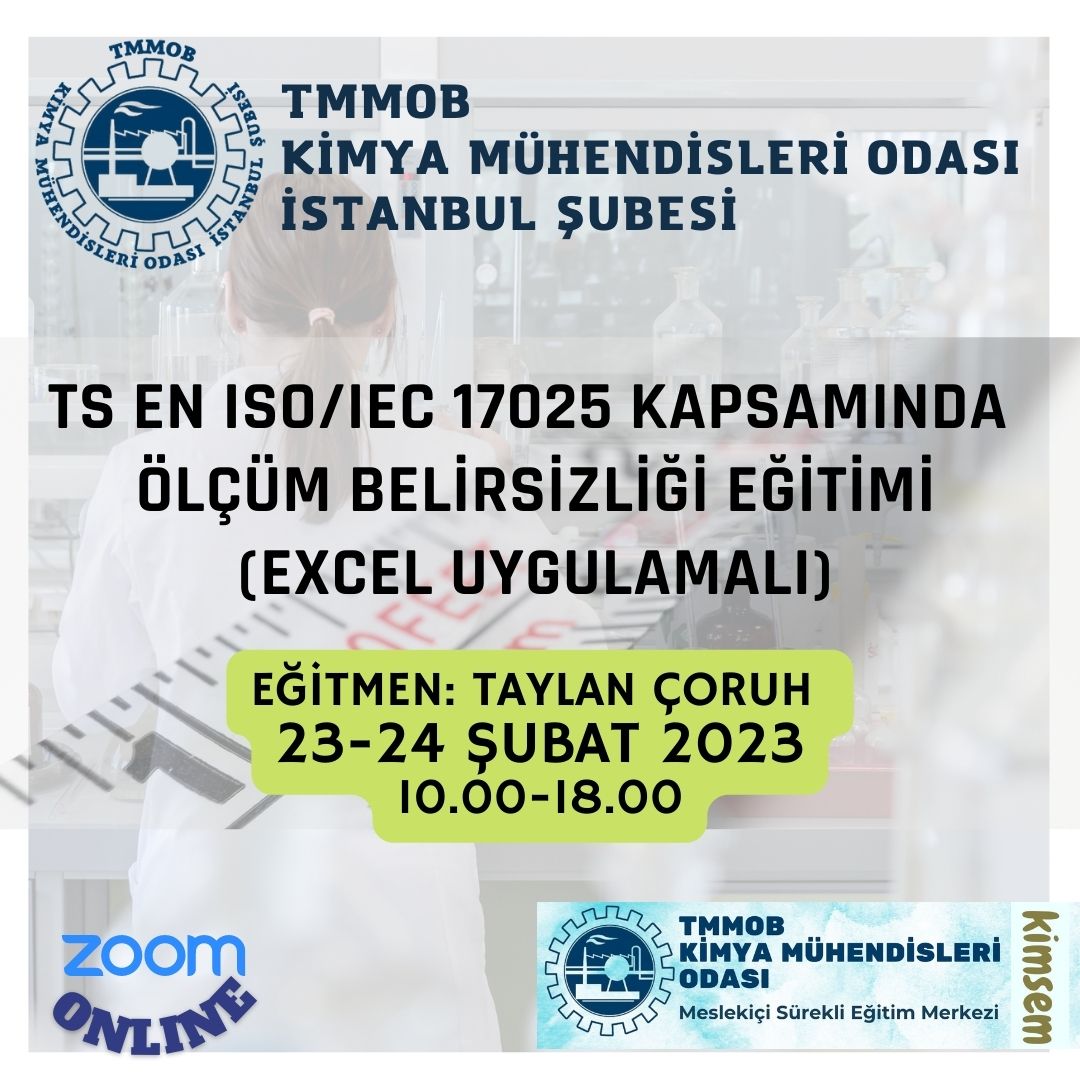 Şubemiz tarafından 23-24 Şubat 2023 tarihlerinde saat 10.00-18.00 saatleri arasında `TS EN ISO/IEC 17025 Kapsamında Ölçüm Belirsizliği (Excel Uygulamalı) Eğitimi` zoom programı üzerinden online olarak düzenlenecektir.