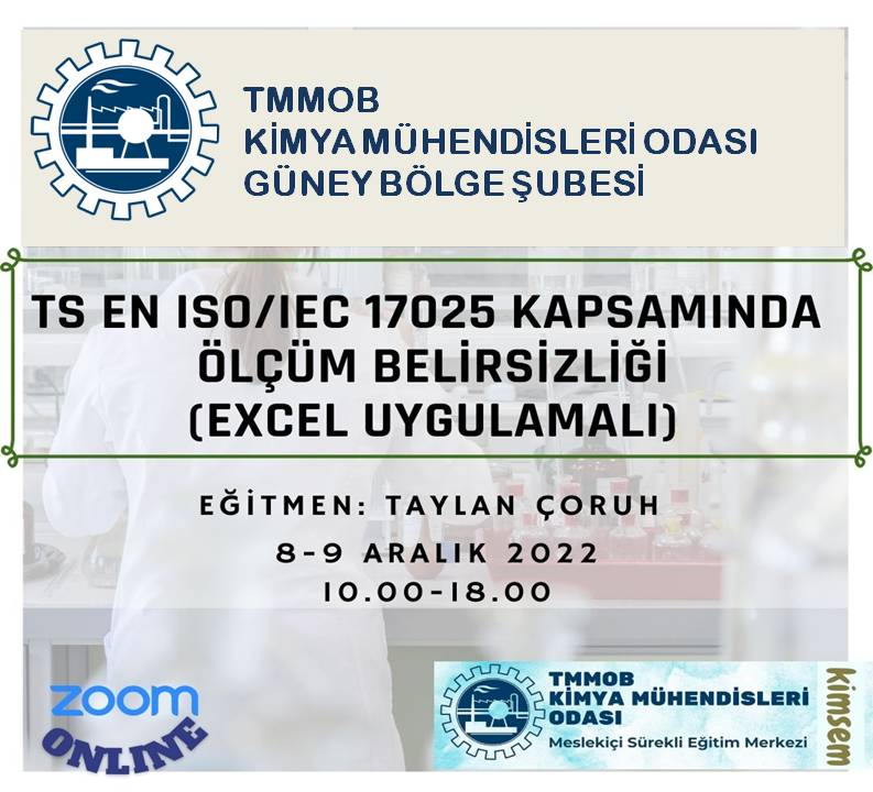8-9 Aralık 2022 tarihlerinde 10.00-18.00 saatleri arasında "TS EN ISO/IEC 17025 Kapsamında Ölçüm Belirsizliği (Excel Uygulamalı) Eğitimi" zoom programı üzerinden online olarak düzenlenecektir. Eğitim ile ilgili detaylı bilgi ve başvuru formunu aşağıda dosyalar kısmında bulabilirsiniz.