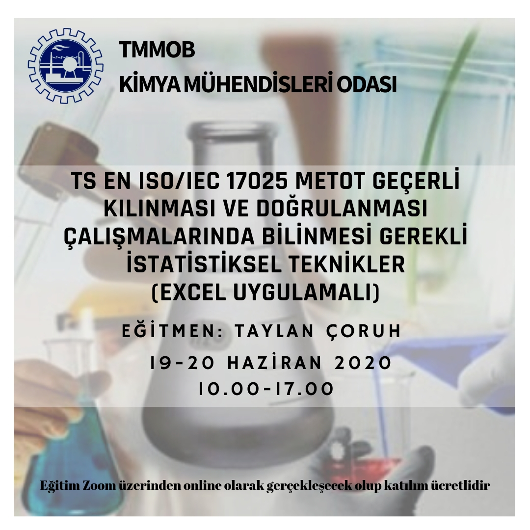 19-20 Haziran 2020 tarihlerinde TS EN ISO/IEC 17025 Metot Geçerli Kılınması ve Doğrulanması Çalışmalarında Bilinmesi Gerekli İstatistiksel Teknikler (Excel Uygulamalı) eğitimimiz Zoom programı üzerinden online olarak düzenlenecektir. Eğitim ile ilgili detayı ve eğitim başvuru formunu ekte bulabilirsiniz. Eğitime katılmak isteyen üyelerimizin, başvuru formunu doldurarak istenilen diğer evraklarla birlikte guney@kmo.org.tr adresine e-mail göndermelerini rica ederiz.