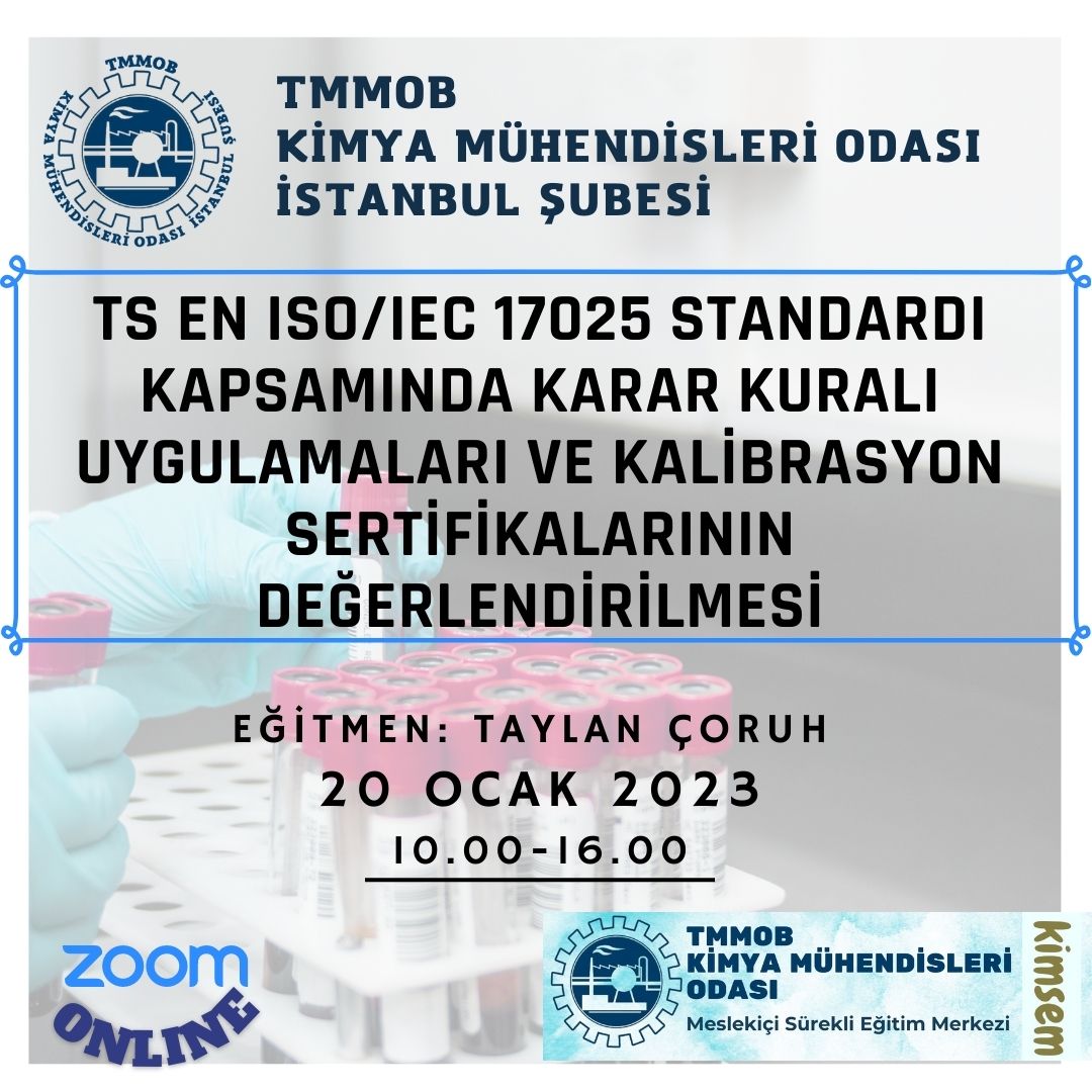 Odamız tarafından 20 Ocak 2023 tarihinde TS EN ISO/IEC 17025 Standardı Kapsamında Karar Kuralı Uygulamaları ve Kalibrasyon Sertifikalarının Değerlendirilmesi Eğitimi zoom uygulaması üzerinden online olarak düzenlenecektir.