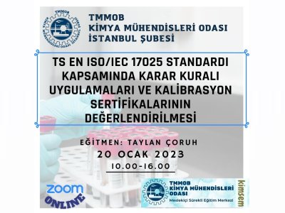 EĞİTİMİN ADI | TS EN ISO/IEC 17025 Standardı Kapsamında Karar Kuralı Uygulamaları ve Kalibrasyon Sertifikalarının Değerlendirilmesi Eğitimi | EĞİTMEN | Taylan Çoruh, Kimya Mühendisi | EĞİTİM YERİ | Eğitimimiz zoom programı üzerinden online gerçekleşecektir. | EĞİTİMİN TARİHİ VE SAATİ | 20 Ocak 2023, Cuma / Saat:10.00-16.00 | KONTENJAN | Eğitime katılım 25 kişi ile sınırlıdır. (Eğitim sınırlı sayıda katılımcıyla gerçekleşeceğinden öncelikli başvurular değerlendirilecektir.) | SON BAŞVURU TARİHİ | 18 Ocak 2023 | EĞİTİMİN AMACI | Karar kuralı uygulamalarında kullanılan değişik yöntemlerin anlatılması ve bu bilgiler ışığında kalibrasyon sertifikalarının değerlendirilmesi. | EĞİTİMİN İÇERİĞİ | · Karar kural hiyerarşisi · Ölçüm belirsizliğini hesaba katan karar kuralları · Güvenlik bantları ve kullanımı · Uygunluk oranları yolu ile karar kuralı · Ölçüm belirsizliğini hesaba katmayan karar kuralları · Kalibrasyon sertifikalarının yorumlanması · Kalibrasyon sertifikalarında sapma düzeltmesi · Örneklerle kalibrasyon sertifikalarının değerlendirilmesi | DERS NOTLARI/ KATILIM BELGESİ | Eğitim notları pdf olarak eğitimden önce katılımcılara e-posta ile iletilecektir. Eğitim katılım belgesi katılımcıların iletmiş olduğu e-posta adreslerine pdf olarak gönderilecektir. | KATILIMCILARDA ARANACAK ŞARTLAR (EĞİTİME KİMLER KATILMALI) | 1) TMMOB`a bağlı bir oda üyesi ya da Kimyager olmak; KMO üyesi olmak; 2) Laboratuvar çalışanları | EĞİTİM BAŞVURU BELGELERİ | *Mühendisler için; Kimlik fotokopisi, TMMOB oda üyelik belgesi ve diploma fotokopisi (Oda üyelik aidat borcu bulunmamalıdır) *Diğer katılımcılar için Nüfus cüzdanı fotokopisi ve diploma fotokopisi, **Eğitim ücreti makbuzu/dekontu, istenilen belgeler ile şube e-posta adresine gönderilmelidir. | EĞİTİM ÜCRETİ | TMMOB ve KMO Üyesi: 750,00 TL Genel Katılımcı: 900,00 TL Eğitim ücretinin yatırılacağı hesap bilgileri: Hesap Adı: TMMOB Kimya Mühendisleri Odası IBAN: TR07 0006 4000 0011 1871 4745 24 (İş Bankası) Odamız KDV ve kurumlar vergisinden muaftır. | İLETİŞİM | 0412 229 61 21, 0534 454 13 30gabtm@kmo.org.tr |