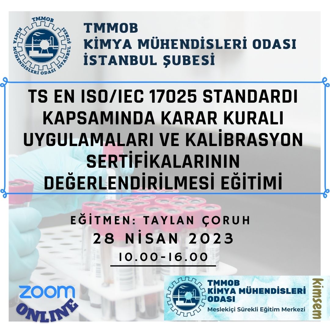 Odamız tarafından 28 Nisan 2023 tarihinde TS EN ISO/IEC 17025 Standardı Kapsamında Karar Kuralı Uygulamaları ve Kalibrasyon Sertifikalarının Değerlendirilmesi Eğitimi zoom uygulaması üzerinden online olarak düzenlenecektir.