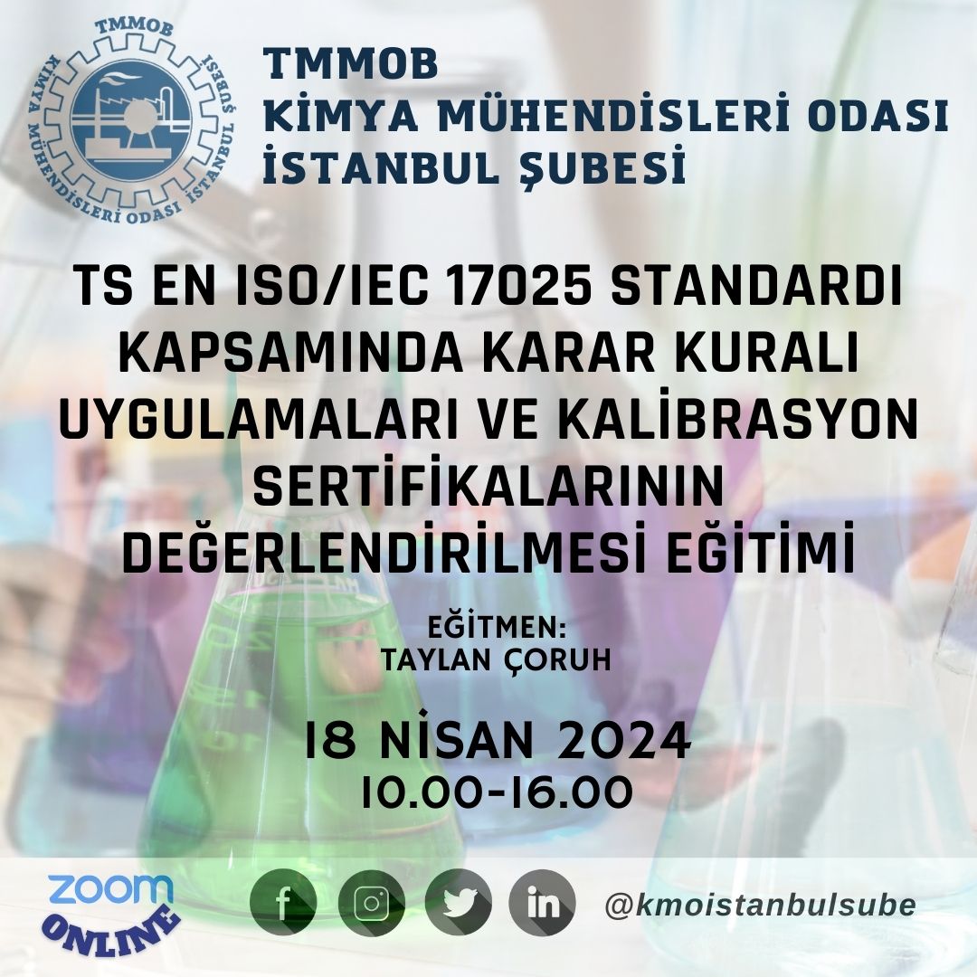 | EĞİTİMİN ADI | TS EN ISO/IEC 17025 Standardı Kapsamında Karar Kuralı Uygulamaları ve Kalibrasyon Sertifikalarının Değerlendirilmesi Eğitimi | | EĞİTMEN | Taylan Çoruh, Kimya Mühendisi | | EĞİTİM YERİ | Eğitimimiz zoom programı üzerinden online gerçekleşecektir. | | EĞİTİMİN TARİHİ VE SAATİ | 18 Nisan 2024, Perşembe / Saat:10.00-16.00 | | KONTENJAN | Eğitime katılım 25 kişi ile sınırlıdır. (Eğitim sınırlı sayıda katılımcıyla gerçekleşeceğinden öncelikli başvurular değerlendirilecektir.) | | SON BAŞVURU TARİHİ | 15 Nisan 2024 | | EĞİTİMİN AMACI | Karar kuralı uygulamalarında kullanılan değişik yöntemlerin anlatılması ve bu bilgiler ışığında kalibrasyon sertifikalarının değerlendirilmesi. | | EĞİTİMİN İÇERİĞİ | · Karar kural hiyerarşisi · Ölçüm belirsizliğini hesaba katan karar kuralları · Güvenlik bantları ve kullanımı · Uygunluk oranları yolu ile karar kuralı · Ölçüm belirsizliğini hesaba katmayan karar kuralları · Kalibrasyon sertifikalarının yorumlanması · Kalibrasyon sertifikalarında sapma düzeltmesi · Örneklerle kalibrasyon sertifikalarının değerlendirilmesi | | DERS NOTLARI/ KATILIM BELGESİ | Eğitim notları pdf olarak eğitimden önce katılımcılara e-posta ile iletilecektir. Eğitim katılım belgesi katılımcıların iletmiş olduğu e-posta adreslerine pdf olarak gönderilecektir. | | KATILIMCILARDA ARANACAK ŞARTLAR (EĞİTİME KİMLER KATILMALI) | 1) TMMOB`a bağlı bir oda üyesi ya da Kimyager olmak; KMO üyesi olmak; 2) Laboratuvar çalışanları | | EĞİTİM BAŞVURU BELGELERİ | *Mühendisler için; Kimlik fotokopisi, TMMOB oda üyelik belgesi ve diploma fotokopisi (Oda üyelik aidat borcu bulunmamalıdır) *Diğer katılımcılar için Nüfus cüzdanı fotokopisi ve diploma fotokopisi, **Eğitim ücreti makbuzu/dekontu, istenilen belgeler ile şube e-posta adresine gönderilmelidir. | | EĞİTİM ÜCRETİ | KMO Üyesi: 1450,00 TL Genel Katılımcı: 2000,00 TL Çalışmayan KMO Üyesi: 1100,00 TL Eğitim ücretinin yatırılacağı hesap bilgileri: Hesap Adı: TMMOB Kimya Mühendisleri Odası IBAN: TR07 0006 4000 0011 1871 4745 24 (İş Bankası) Odamız KDV ve kurumlar vergisinden muaftır. | | İLETİŞİM | 0216 449 37 10-11-12, 0533 486 55 49 seval.ozturk@kmo.org.tr | |
