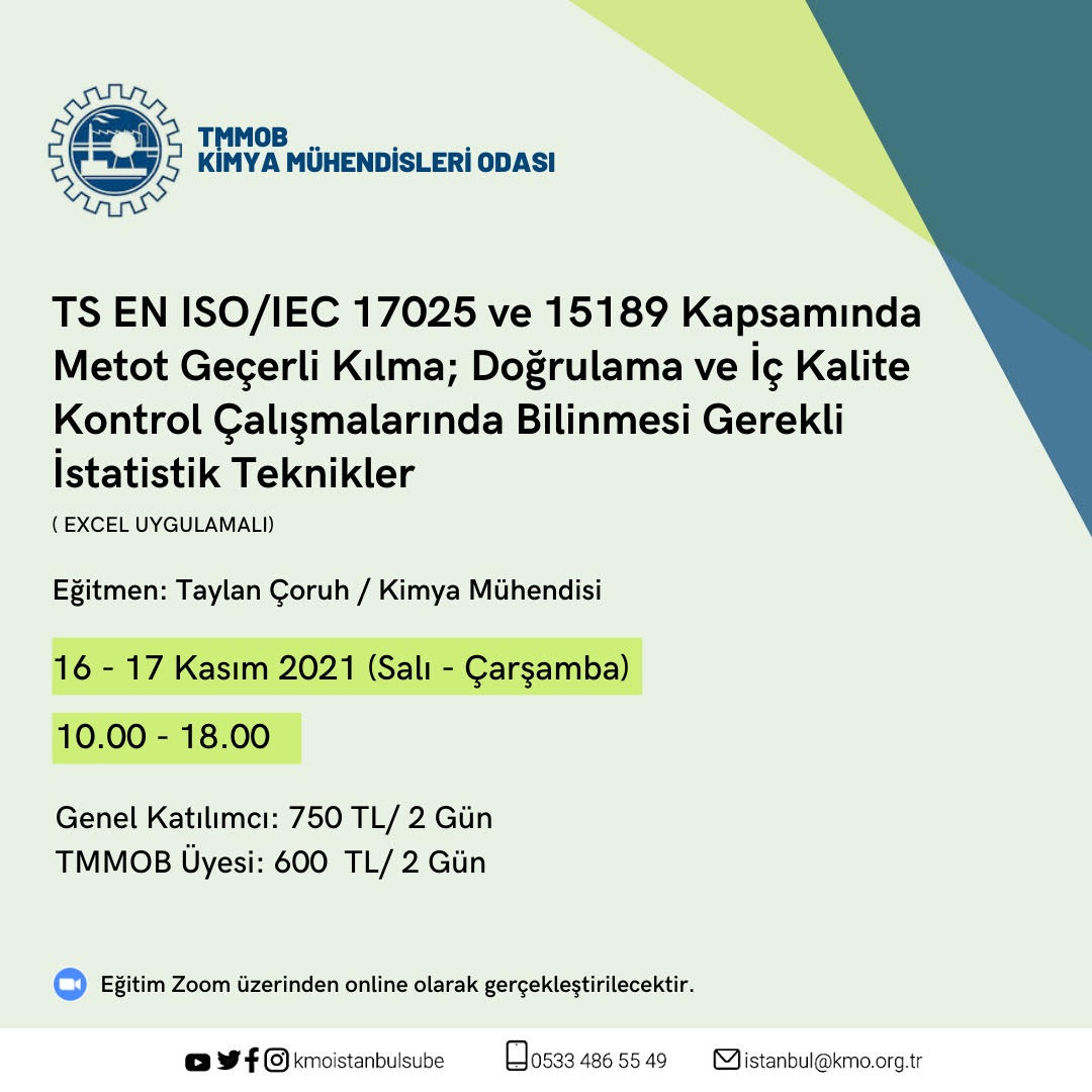 16-17 Kasım 2021 tarihlerinde TS EN ISO/IEC 17025 VE 15189 KAPSAMINDA METOT GEÇERLİ KILMA; DOĞRULAMA VE İÇ KALİTE KONTROL ÇALIŞMALARINDA BİLİNMESİ GEREKLİ İSTATİSTİK TEKNİKLER (EXCEL UYGULAMALI) online olarak zoom programı üzerinde düzenlenecektir. Eğitim ile ilgili detaylı bilgi aşağıda yer almakta olup eğitim başvuru formunu ekte dosyalar kısmında bulabilirsiniz. Eğitime katılmak isteyen üyelerimizin ekte yer alan başvuru formunu doldurarak istanbul@kmo.org.tr e-mail adresine göndermelerini rica ederiz.