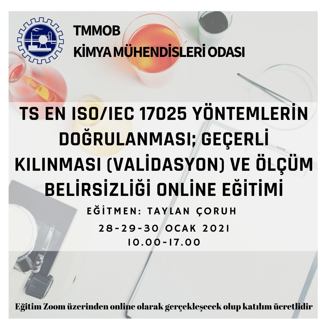 28-29-30 Ocak 2021 tarihlerinde TS EN ISO/IEC 17025 Yöntemlerin Doğrulanması; Geçerli Kılınması (Validasyon) ve Ölçüm Belirsizliği Eğitimi online olarak zoom programı üzerinde düzenlenecektir.