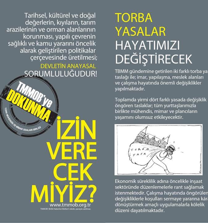 Çevre ve Şehircilik Bakanlığının 6235 sayılı TMMOB Kanunu değişikliğini de içeren "3194 sayılı İmar Kanunu ile Bazı Kanun ve Kanun Hükmünde Kararnamelerde Değişiklik Yapılmasına Dair Kanun Tasarısı" isimli Torba Yasa taslağı ile;