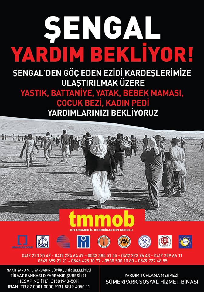 Şengal`de IŞİD çetelerinin saldırıları yüzünden topraklarını terk etmek ve ülkemize sığınmak zorunda kalan Ezidi halkına dönük olarak bölgede TMMOB`ye bağlı odaların şubeleri yardım kampanyası başlattı. Bizler de bu yardım kampanyasına destek olmak amacıyla TMMOB Mimarlar Odası İstanbul Büyükkent Şubesi (Karaköy) ve TMMOB Kimya Mühendisleri Odası İstanbul Şubesi (Kadıköy) olarak yardım toplama merkezleri oluşturduk. Yardımda bulunmak isteyen üyelerimizin, ihtiyaç listesinde bulunan yardım malzemelerini, aşağıda bulunan yardım merkezlerine iletebileceğini bildirir, saygılarımızı sunarız.