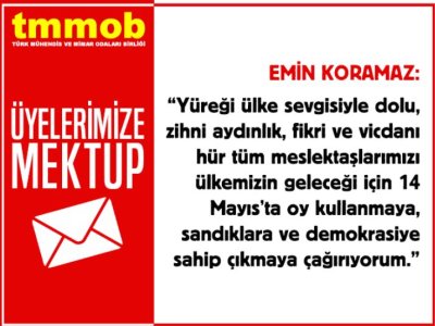14 Mayıs 2023 tarihinde gerçekleştirilecek olan Cumhurbaşkanı ve Milletvekili Genel Seçimleri'nin anlam ve önemine ilişkin TMMOB Yönetim Kurulu Başkanı Emin Koramaz tarafından üyelerimize mektup gönderildi.