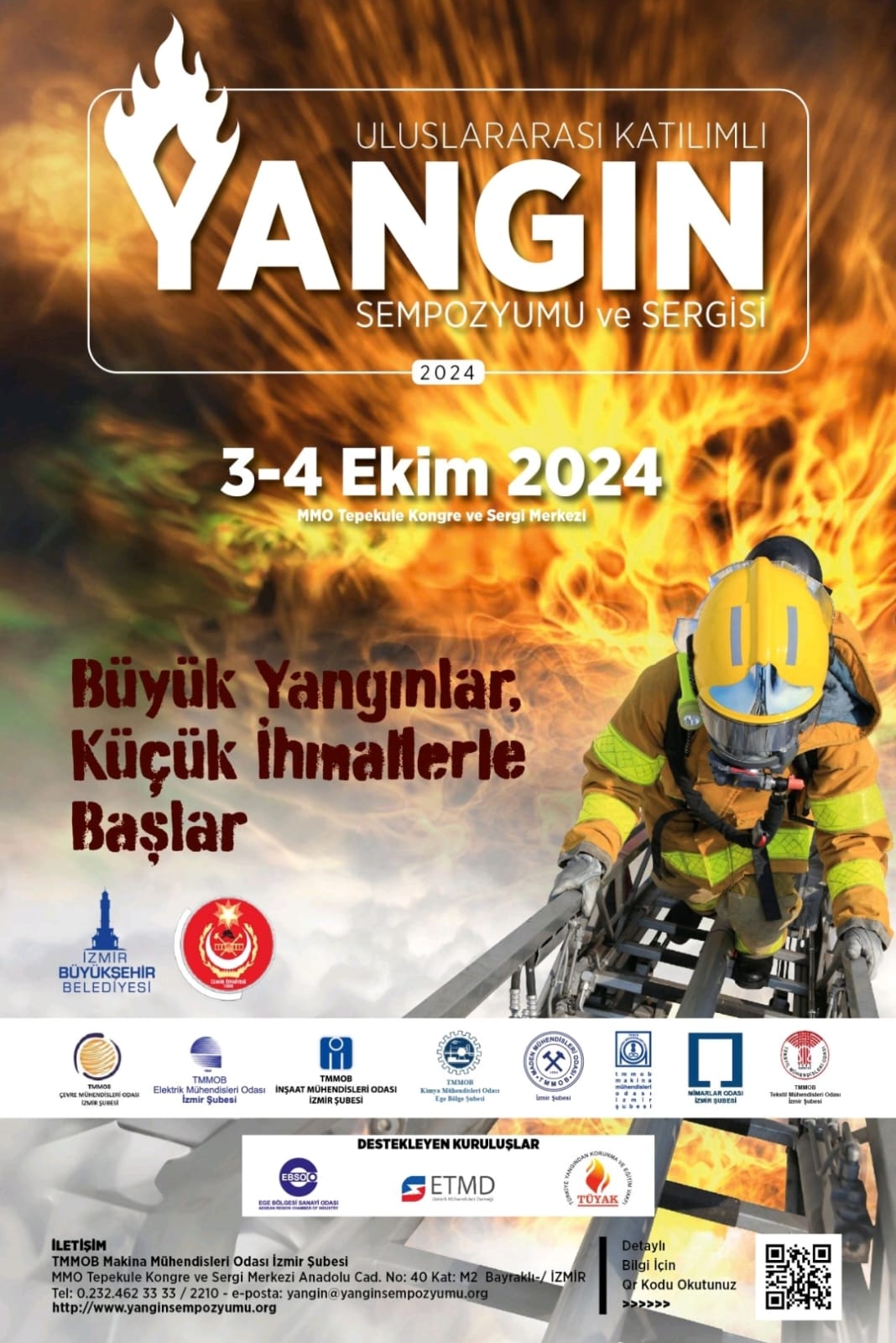 İzmir Büyükşehir Belediyesi İtfaiye Daire Başkanlığı ile Makina Mühendisleri Odası, İnşaat Mühendisleri Odası, Elektrik Mühendisleri Odası, Çevre Mühendisleri Odası, Kimya Mühendisleri Odası, Tekstil Mühendisleri Odası, Mimarlar Odası, Maden Mühendisleri Odası işbirliğiyle düzenlenecek Uluslararası Katılımlı Yangın Sempozyumu ve Sergisi 3-4 Ekim 2024 tarihlerinde MMO Tepekule Kongre ve Sergi Merkezi`nde genel katılıma açık olarak gerçekleştirilecek olup, programa bilgisine ekten ulaşabilirsiniz.