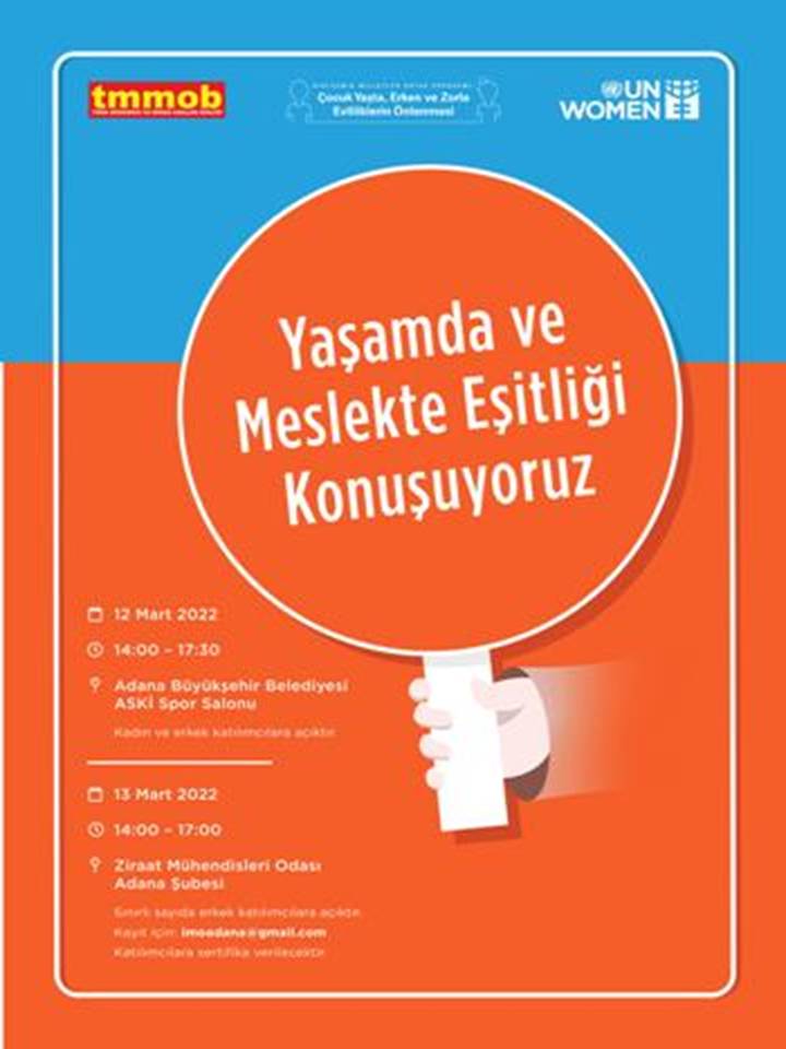 TMMOB Adana İKK Kadın Çalışma Grubu ve Birleşmiş Milletler Kadın Birimi (UN Women) iş birliği içerisinde; Toplumsal normları ve toplumsal cinsiyet eşitliğine yönelik tutumları değiştirmek, kadınlar ve kız çocuklarının kaynaklara, fırsatlara ve haklara daha iyi ve eşit erişime sahip olacağı; şiddet ve ayrımcılık olmadan bir yaşam sürecekleri yaşamı birlikte inşa etmek adına; "Yaşamda ve Meslekte Eşitliği Konuşuyoruz" eğitimini düzenlemektedir.