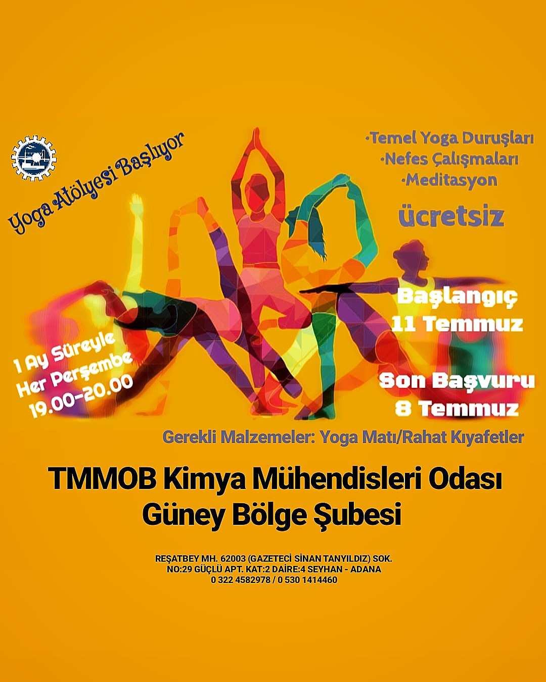 Şubemiz üyesi meslektaşlarımıza ve öğrenci üyelerimize yönelik Kimya Mühendisleri Odası Güney Bölge Şubesi Yoga Atölyesini başlatıyoruz. Atölyemize başvurular 8 Temmuz tarihine kadar alınacak olup, atölye 11 Temmuz tarihinde başlayacaktır. Atölyeye başvuru için iletişim bilgilerindeki numaraları arayabilirsiniz.