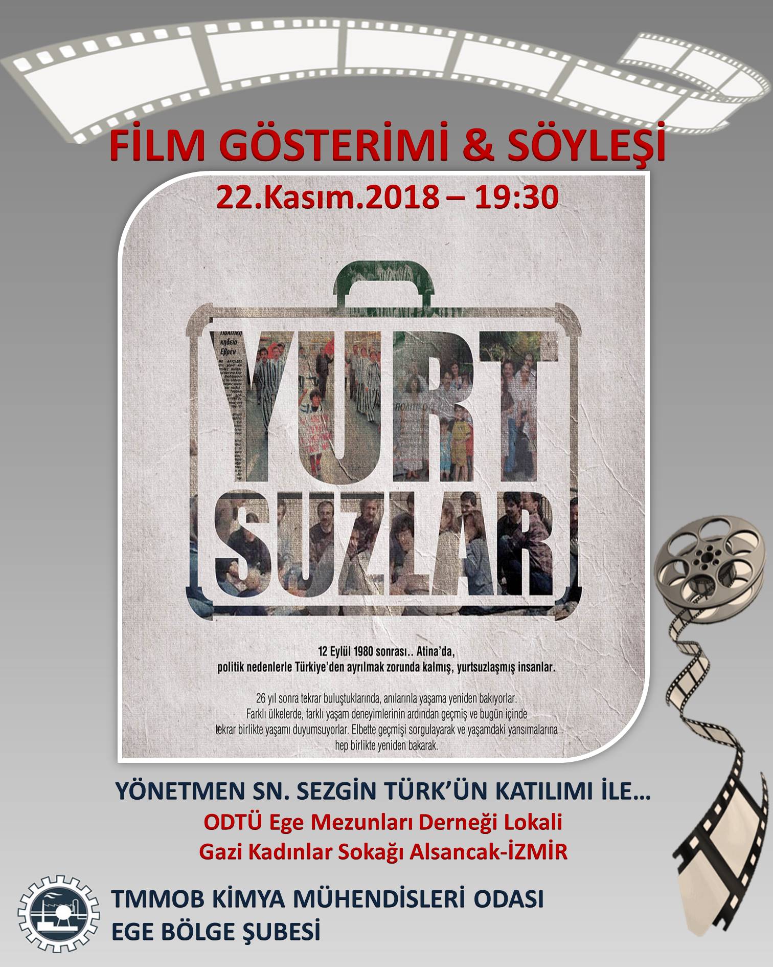 Politik nedenlerle Türkiyeden ayrılmak zorunda kalmış, yurtsuzlaşmış insanların hikayesinin anlatıldığı, Sn. Sezgin Türkün yönettiği ve bizimle birlikte olacağı "YURTSUZLAR" filmini birlikte izlemek istiyoruz...