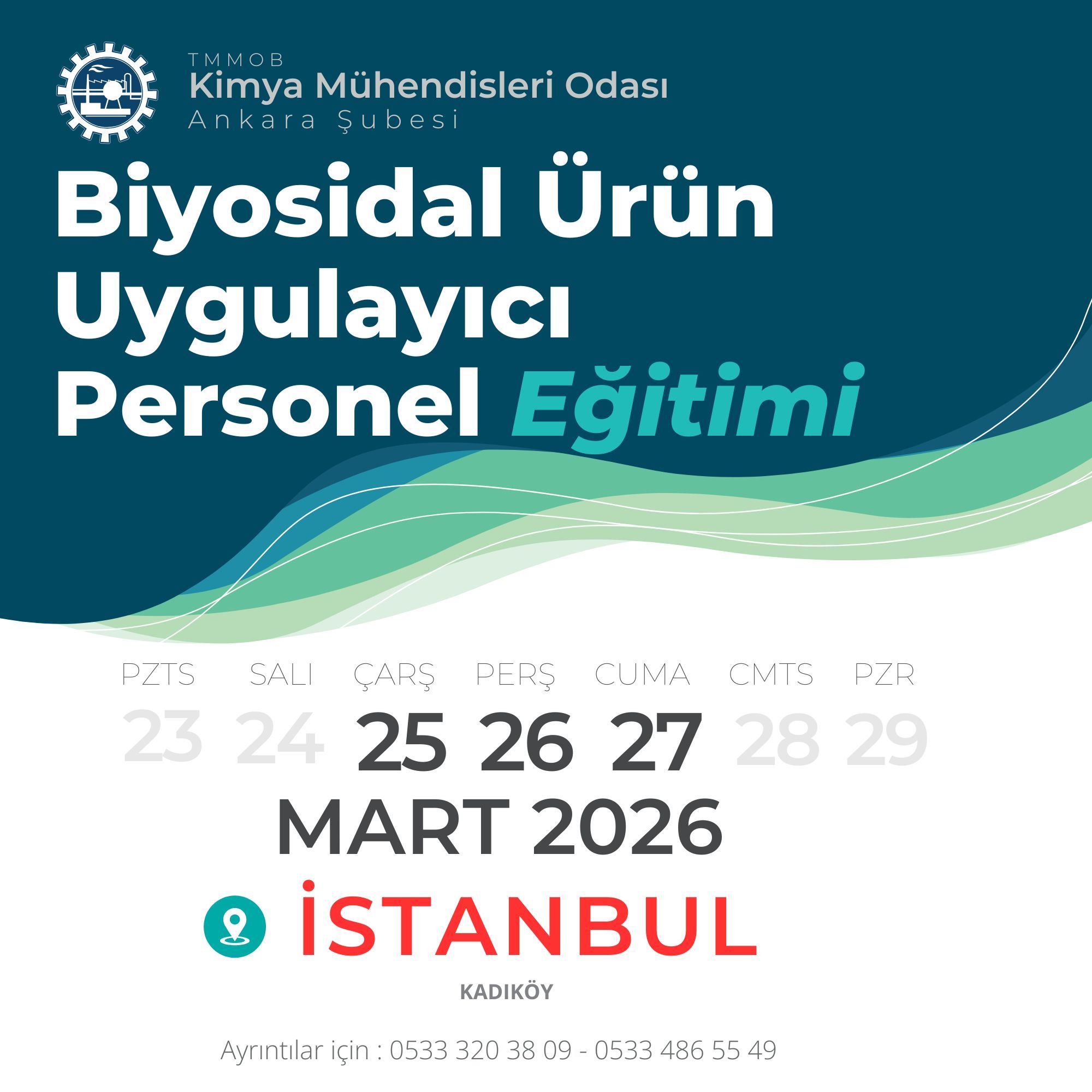 Biyosidal Ürün Uygulayıcı Personel Eğitimi 25-26-27 Mart 2026 tarihinde Kadıköy'deki eğitim salonumuzda yapılacaktır.