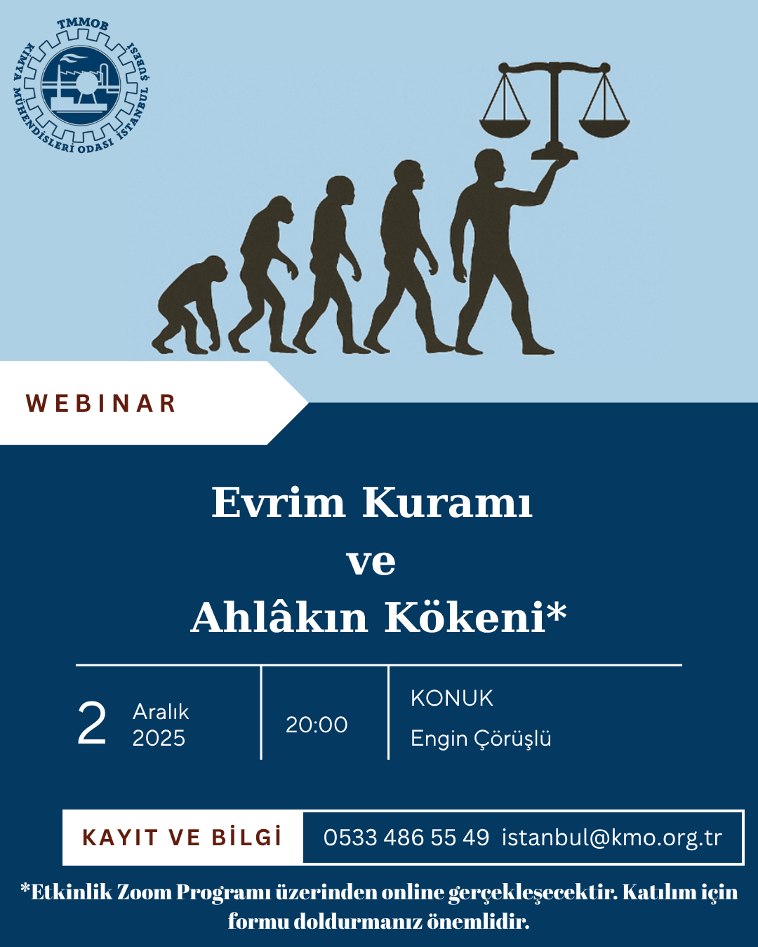 Şubemiz tarafından düzenlenen bu çevrim içi etkinlikte, konuk konuşmacımız Engin Çörüşlü, evrim kuramının temel prensiplerini ve erdem/ahlâk kavramının doğal kökenlerini bilimsel bir yaklaşımla ele alacaktır.