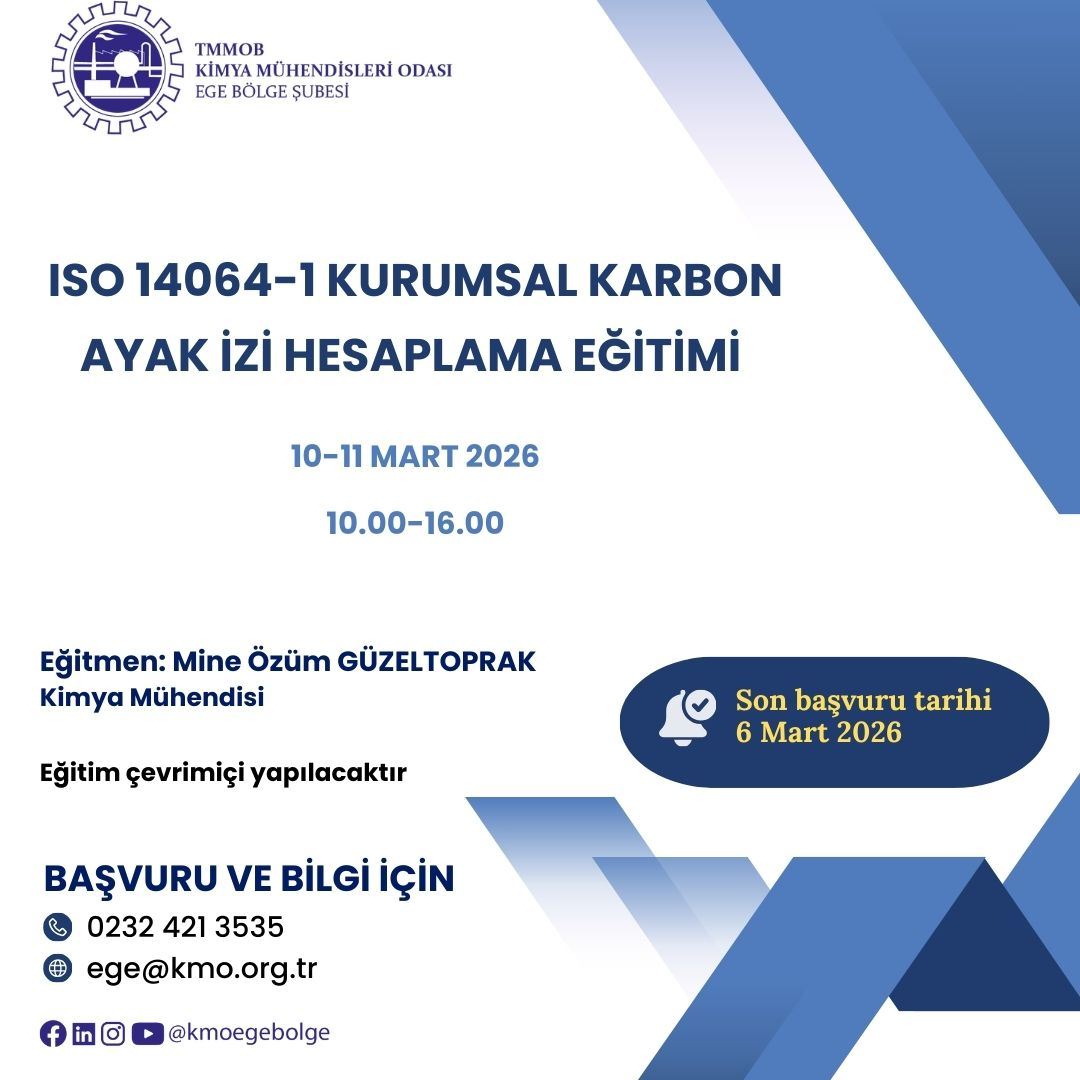 TMMOB Kimya Mühendisleri Odası Bursa Şubemiz organizasyonuyla, 10-11 Mart 2026 tarihlerinde 10.00-16.00 saatleri arasında, " ISO 14064-1 KURUMSAL KARBON AYAK İZİ HESAPLAMA EĞİTİMİ " zoom programı üzerinden online olarak düzenlenecektir. Eğitim ile ilgili detaylı bilgi aşağıda yer almakta olup eğitime katılmak isteyenlerin, aşağıdaki başvuru formunu doldurup istenen belgeler ile birlikte 6 Mart 2026 Cuma gününe kadar ege@kmo.org.tr adresine göndermelerini rica ederiz.