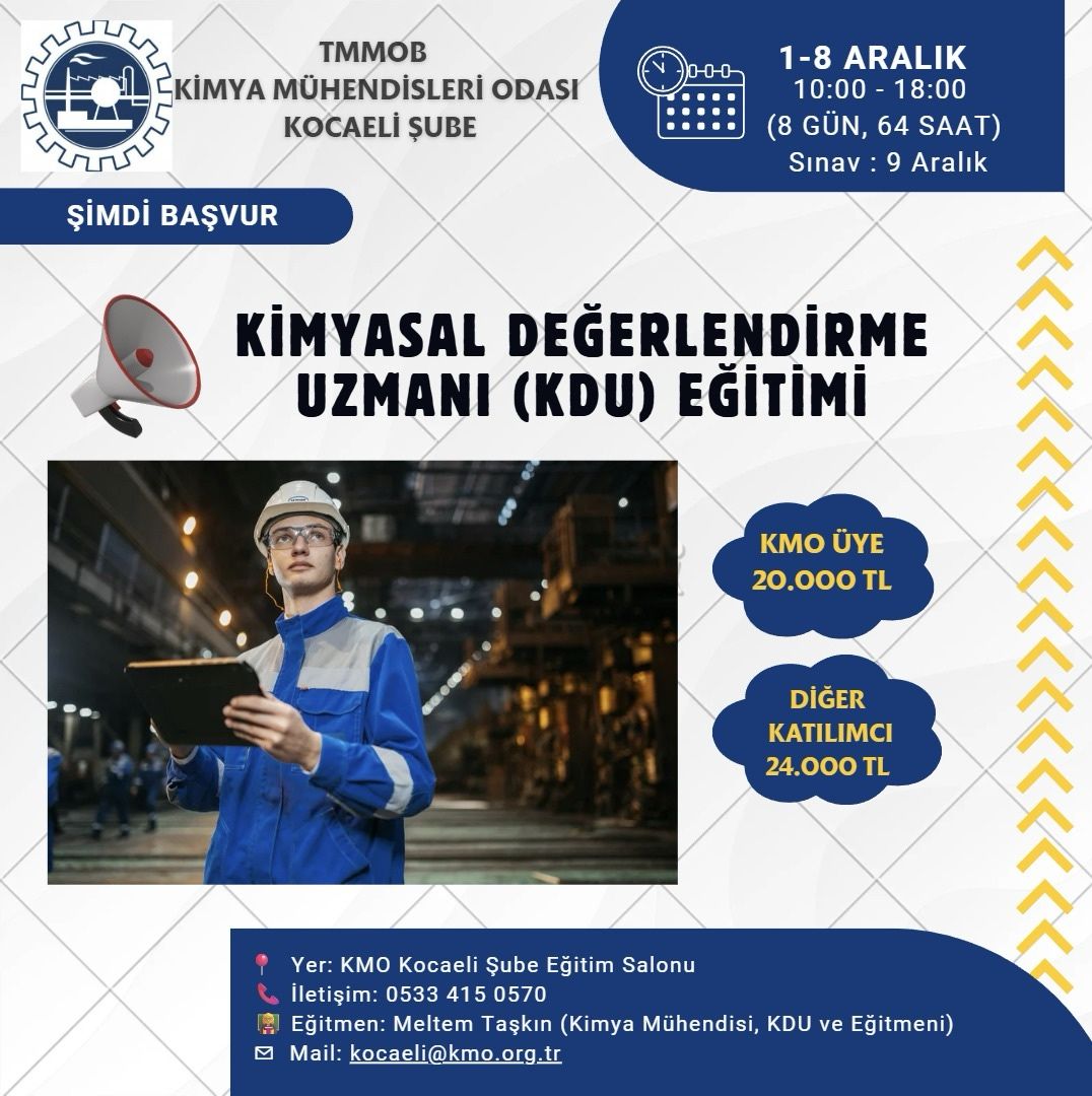 Şubemiz tarafından, T.C. Çevre ve Şehircilik Bakanlığı tarafından 23 Haziran 2017 tarih ve 30105 (Mükerrer) sayılı Resmi Gazete`de yayımlanmış olan "Kimyasalların Kaydı, Değerlendirilmesi, İzni ve Kısıtlanması (KKDİK) Hakkında Yönetmeliği" kapsamında 1-2-3-4-5-6-7-8 Aralık 2025 tarihlerinde KİMYASAL DEĞERLENDİRME UZMANI (KDU) EĞİTİMİ programlanmıştır. Eğitimimize katılım kontenjanı 15 ile sınırlı olup son başvuru tarihi 28 Kasım 2025 tarihidir. Eğitime katılım önceliği başvuru sırasına göre verilecektir.
