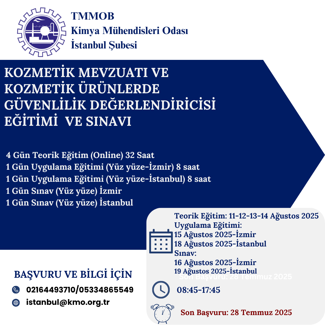 11-12-13-14-15-16, 18-19 Ağustos 2025 tarihlerinde, İstinye Üniversitesi Teknoloji Araştırma Geliştirme İnovasyon ve Danışmanlık A.Ş. bünyesinde, Kimya Mühendisleri Odası işbirliği ile, "KOZMETİK MEVZUATI VE KOZMETİK ÜRÜNLERDE GÜVENLİLİK DEĞERLENDİRİCİSİ EĞİTİMİ" düzenlenecektir. Eğitim ile ilgili detaylı bilgi aşağıda yer almakta olup eğitim başvuru formunu aşağıda/ekte bulabilirsiniz.