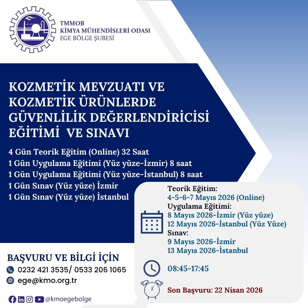 4-5-6-7-8-9, 12-13 Mayıs 2026 tarihlerinde, İstinye Üniversitesi Teknoloji Araştırma Geliştirme İnovasyon ve Danışmanlık A.Ş. bünyesinde, Kimya Mühendisleri Odası işbirliği ile, "KOZMETİK MEVZUATI VE KOZMETİK ÜRÜNLERDE GÜVENLİLİK DEĞERLENDİRİCİSİ EĞİTİMİ" düzenlenecektir. Eğitim ile ilgili detaylı bilgi aşağıda yer almakta olup eğitim başvuru formunu aşağıda/ekte bulabilirsiniz. Son başvuru tarihi 22 Nisan 2026 olup, eğitime katılmak isteyenlerin, başvuru formunu doldurarak ege@kmo.org.tr e-posta adresine göndermelerini rica ederiz.