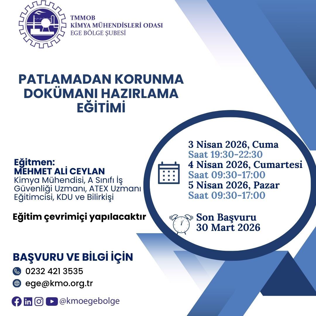 TMMOB Kimya Mühendisleri Odası tarafından 3-4-5 Nisan 2026 tarihlerinde “Patlamadan Korunma Dokümanı Hazırlama Eğitimi” Zoom uygulaması üzerinden online olarak düzenlenecektir.