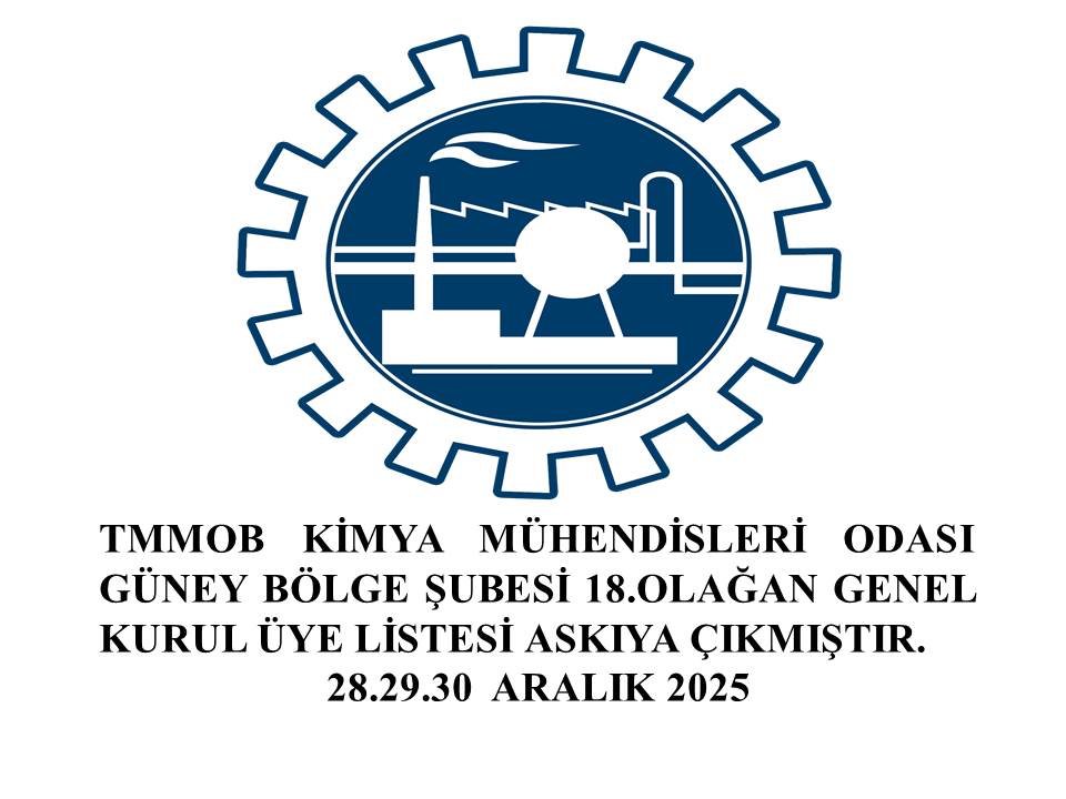 Şubemiz 18. Olağan Genel Kurulu ve seçimleri 03-04 Ocak 2026 tarihlerinde çoğunluklu, çoğunluk sağlanamadığı takdirde 10-11 Ocak 2026 tarihlerinde çoğunluksuz olarak aşağıda belirtilen gündem ve adreste 1. günü genel kurul saat 11.00 - 14.00 arası, 2. günü seçimler ise saat 9.00 – 17.00 arasında yapılacaktır. Seçime; Adana, Mersin, Hatay, Osmaniye, Kahramanmaraş, Gaziantep ve Kilis illerindeki Şubemize kayıtlı Kimya Mühendisleri katılacaktır.
