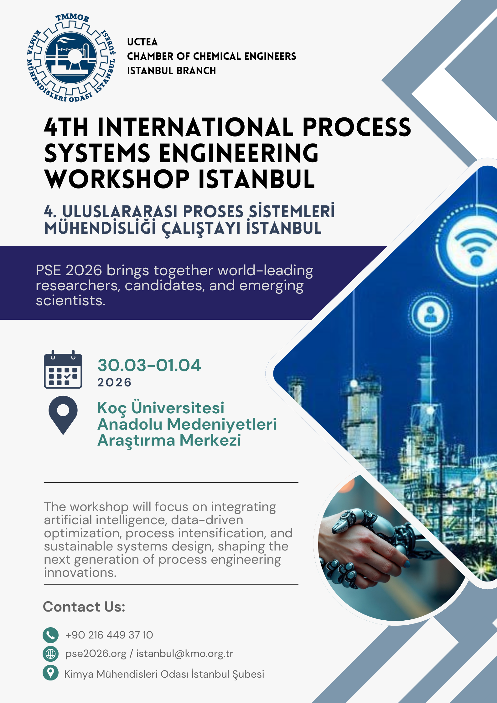 4. Uluslararası Proses Sistemleri Mühendisliği Çalıştayı, 30 Mart-1 Nisan 2026 tarihleri arasında Kimya Mühendisleri Odası İstanbul Şubesi tarafından Koç Üniversitesi Anadolu Medeniyetleri Araştırma Merkezi’nde yapılacaktır.
