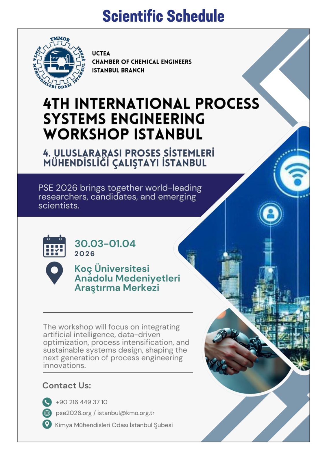 TMMOB Kimya Mühendisleri Odası İstanbul Şubesi tarafından düzenlenen 4. Uluslararası Proses Sistemleri Mühendisliği Çalıştayı, 30 Mart - 1 Nisan 2026 tarihlerinde Koç Üniversitesi Anadolu Medeniyetleri Araştırma Merkezi’nde gerçekleştirilecektir. Çalıştaya dair bilimsel program ve detaylı bilgiler yazımız ekinde yer almaktadır.